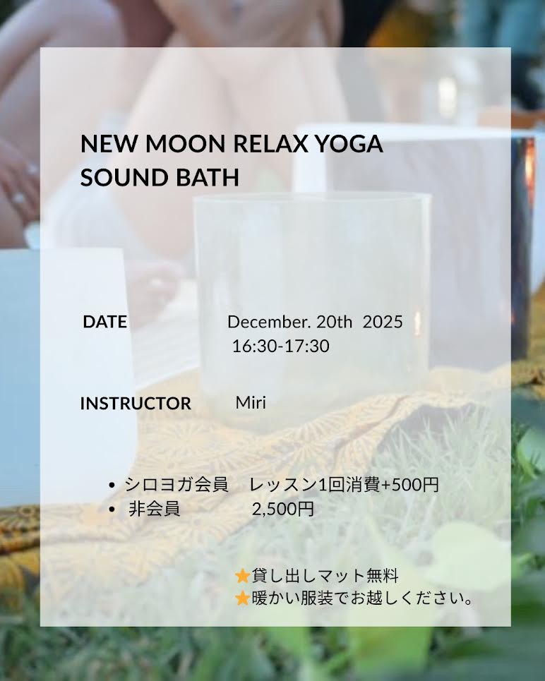 シロヨガ特別レッスンのお知らせ 2025.12.02 特別レッスンのお知らせ 12月20日(土) 16時30分~17時30分 クリスタルヒーリングヨガ miri先生 新月の夜に忙しさから離れて心静かに ヨガのレッスンはいかがでしょうか。 初めての方もぜひこの機会にシロヨガにお越しください。 ・シロヨガ会員様 レッスン1回消費+500円 ・非会員様 2,500円 ご予約はコチラからお願いいたします。 ヨガ・ピラティス秋のキャンペーン♪ 前の記事