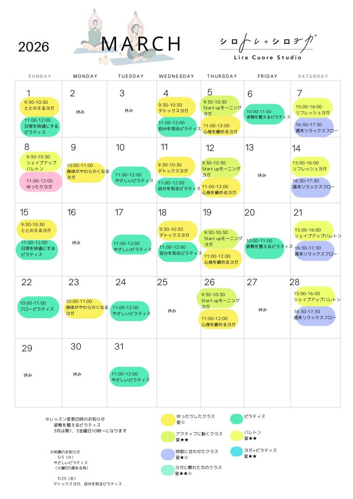 シロヨガ3月のレッスンスケジュールをお知らせいたします!